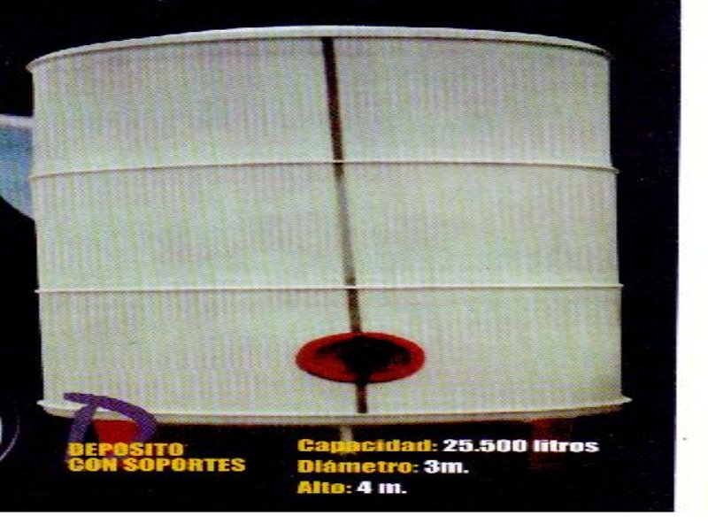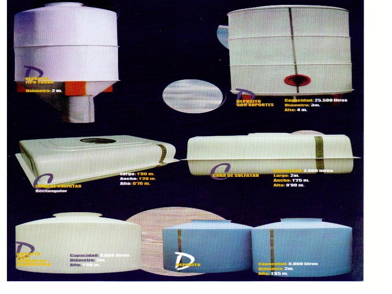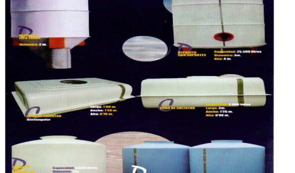 Depósitos fabricados en poliéster de fibra de vidrio y resina, de pequeña y gran capacidad, durabilidad y estanqueidad absoluta. Para contenidos alimenticios y ácidos. Los depósitos se terminarán pintados en el color que el cliente elija.