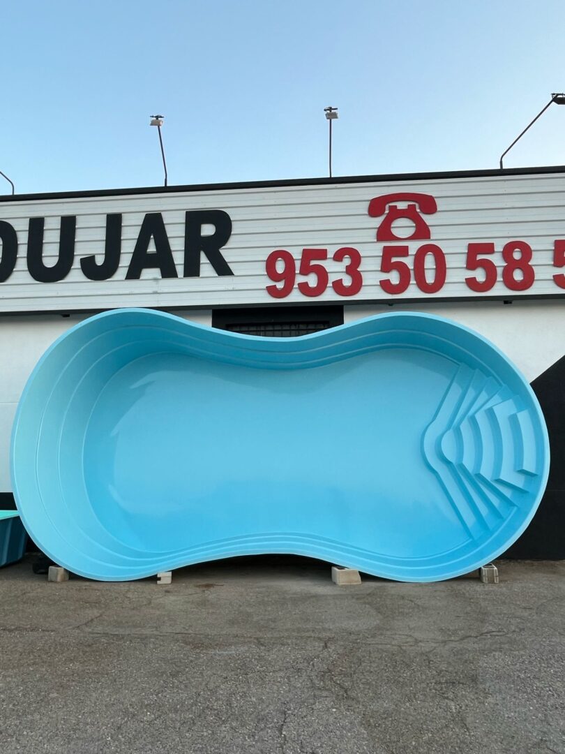 Fabricación con resina de poliéster y fibra de vidrio, con tejidos alternos, refuerzos laterales y perfiles U (poliéster y metálico revestido) que rodean el perímetro. Dotación estándar: skimmer, boquillas de impulsión, toma de limpiafondos y desagüe.